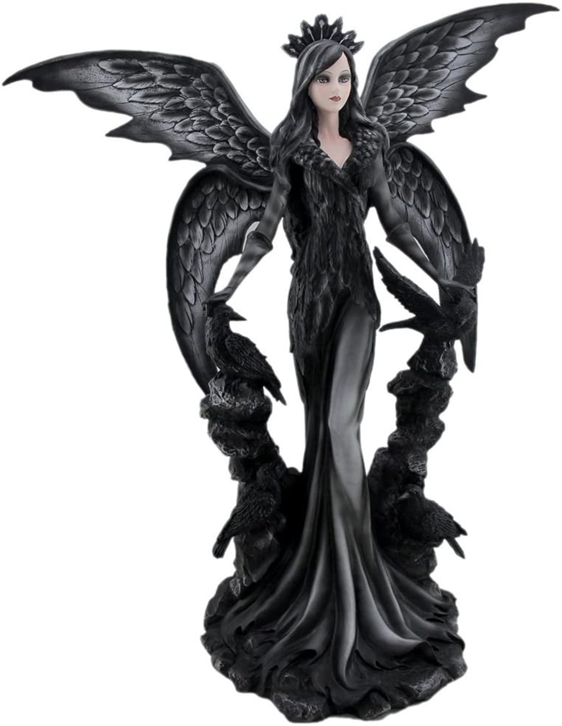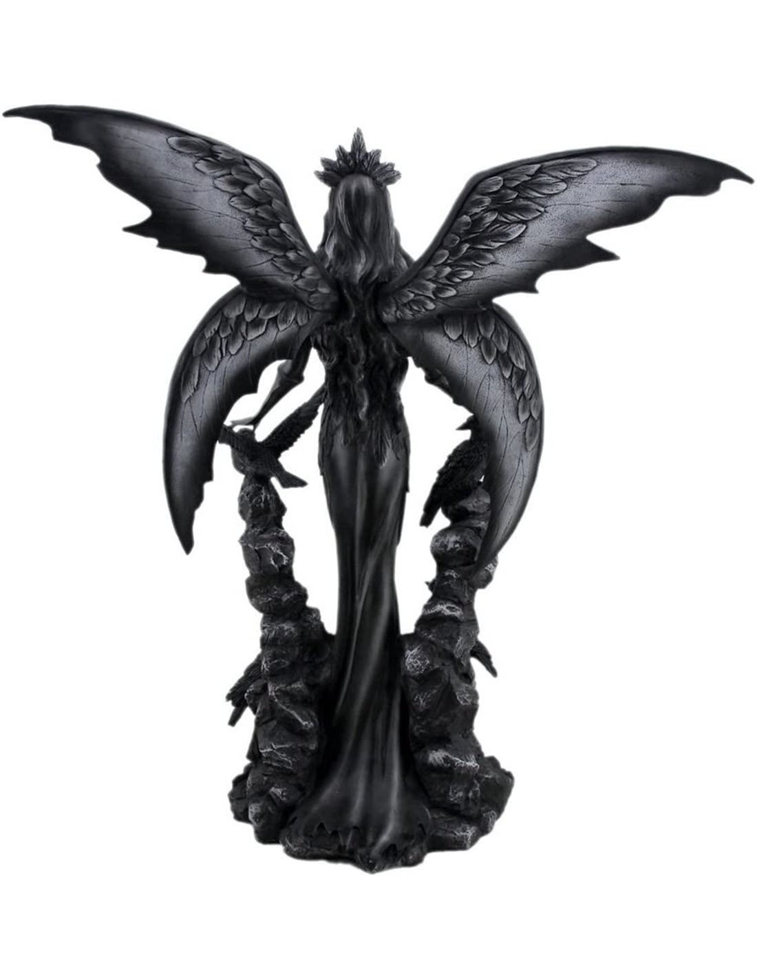 Este imponente Ángel Raven negro se alza entre dos columnas negras, acompañado por cuervos que simbolizan sabiduría y misterio. Una figura poderosa que combina la majestuosidad y la sombra, perfecta para quienes buscan un toque gótico y profundo en su colección.