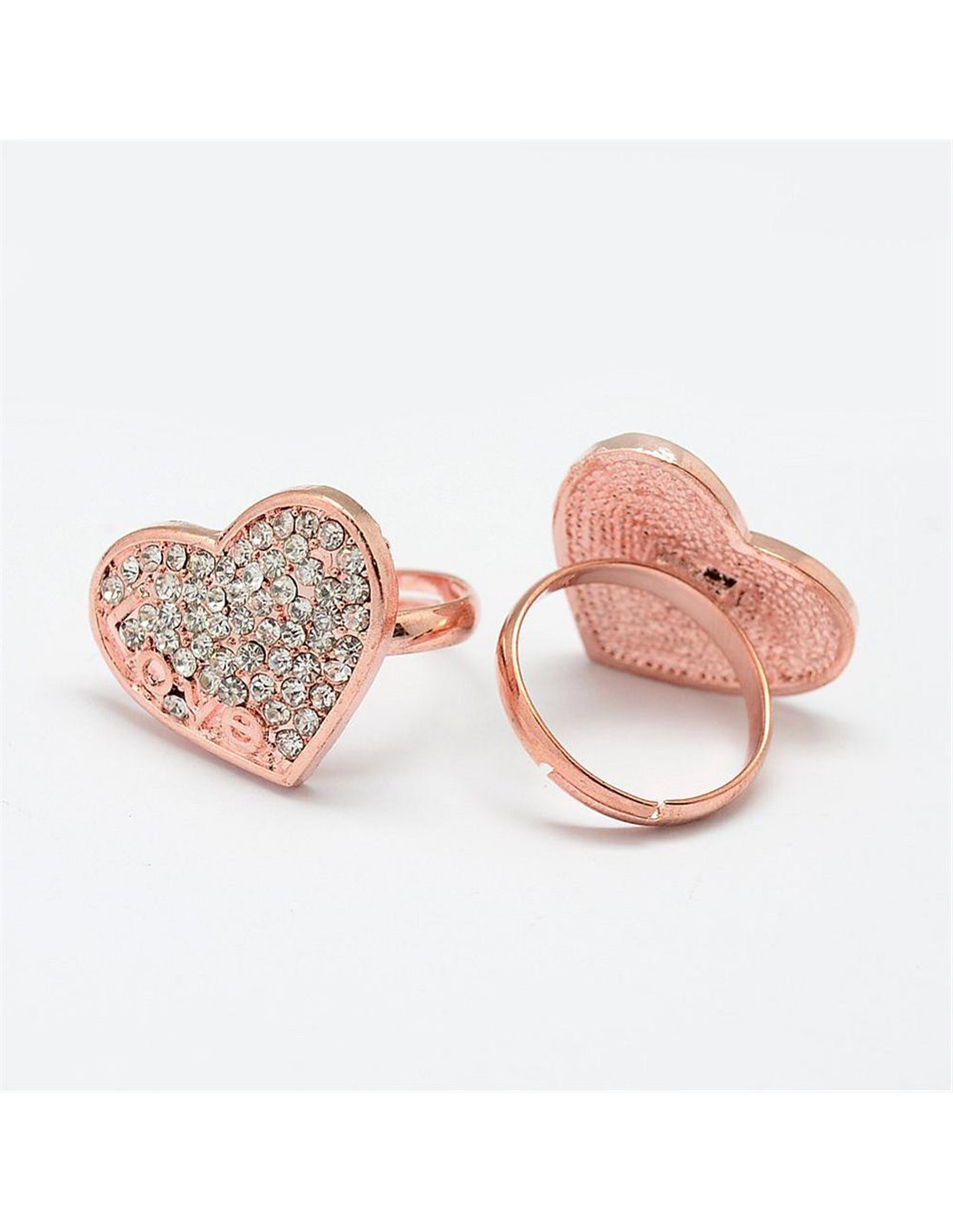 Anillo en forma de corazón, color rosa, con cristales incrustados.