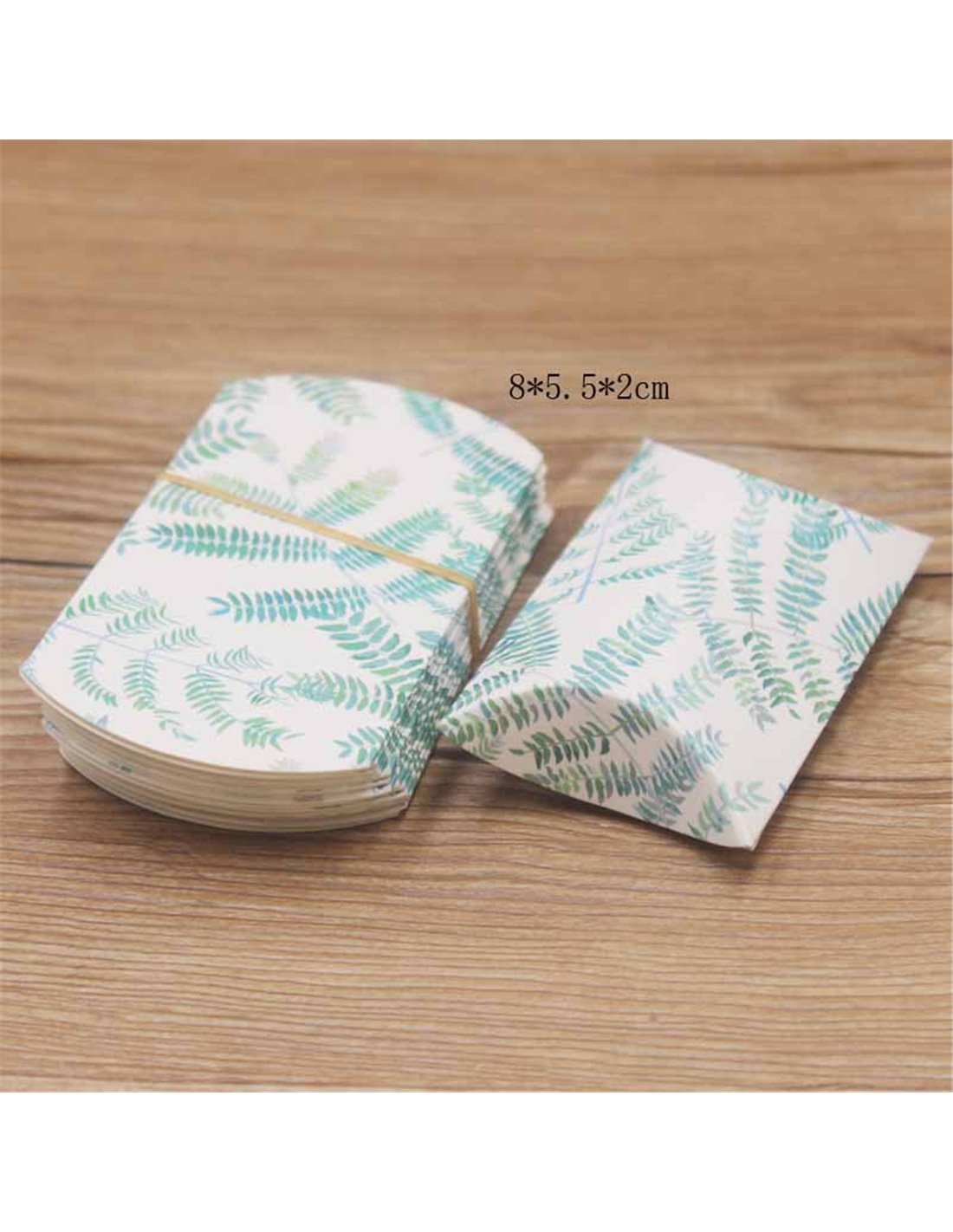 Sobre - caja de papel Kraft, en color beig con dibujo de hojas en verde, con medidas 8 x 5.5 x 2 cms, aprox, una vez montado.