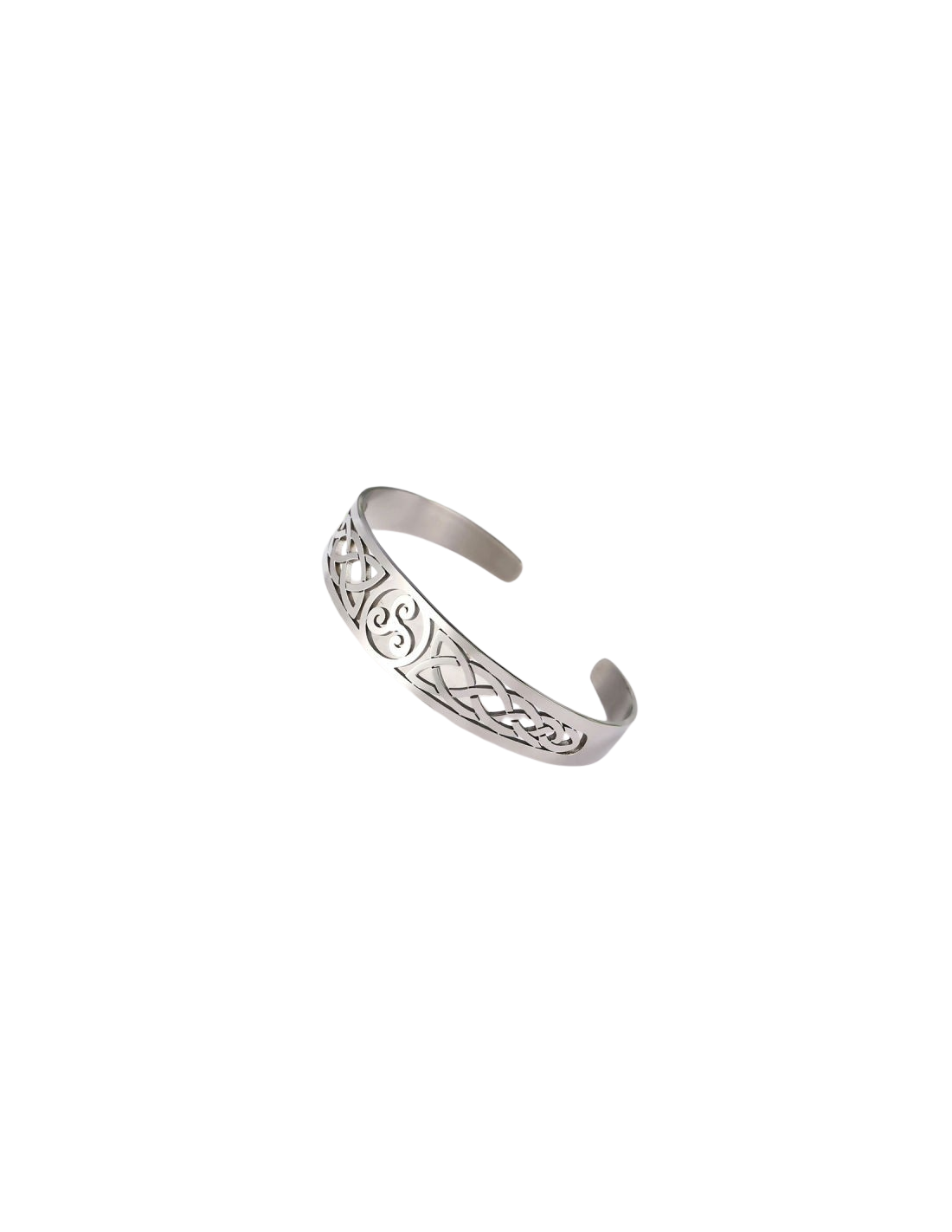 Pulsera abierta, tipo brazalete, en color plateado, con trisquel como detalle central.
