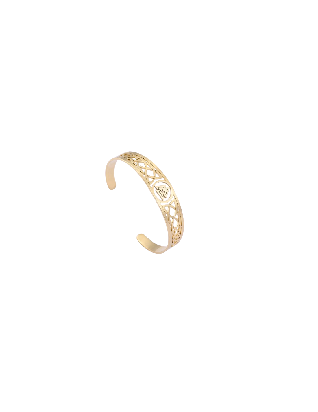 Pulsera abierta, tipo brazalete, en color dorado, con símbolo del valkanut como detalle central.