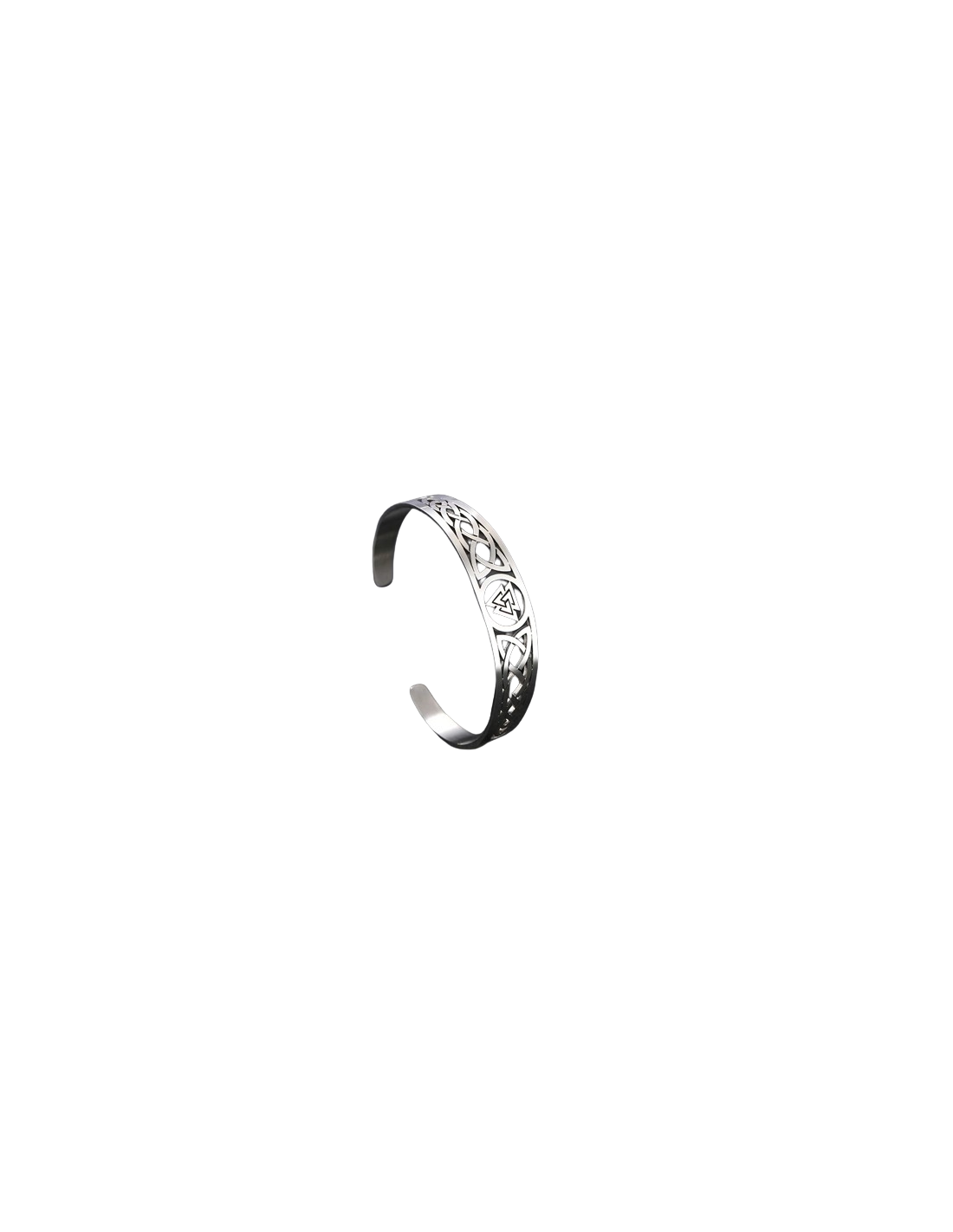 Pulsera abierta, tipo brazalete, en color plateado, con símbolo del valkanut como detalle central.