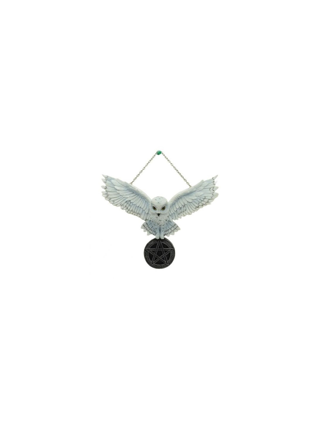 Esta impresionante figura muestra un búho blanco, símbolo de pureza, intuición y guía espiritual, con sus alas abiertas en señal de protección y libertad. El pentagrama, emblema sagrado de equilibrio y conexión con los cuatro elementos y el espíritu, refuerza su energía mágica y protectora.