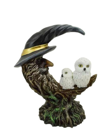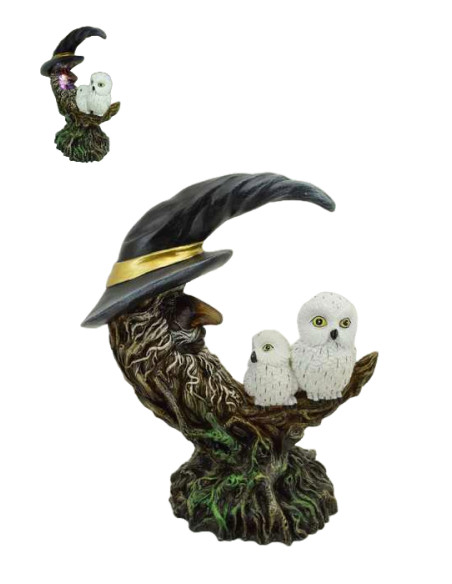 Esta encantadora figura ilumina la magia nocturna con búhos sabios posados sobre una luna llena, cada uno luciendo un sombrero de bruja que simboliza la conexión con el misterio, la intuición y el poder oculto. La luz integrada realza la energía protectora y la presencia espiritual de estos guardianes alados.