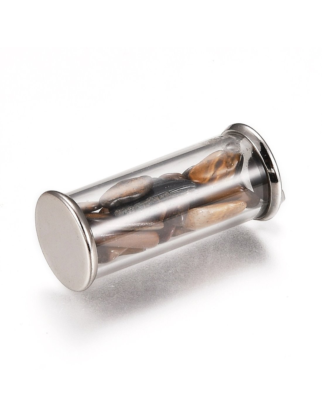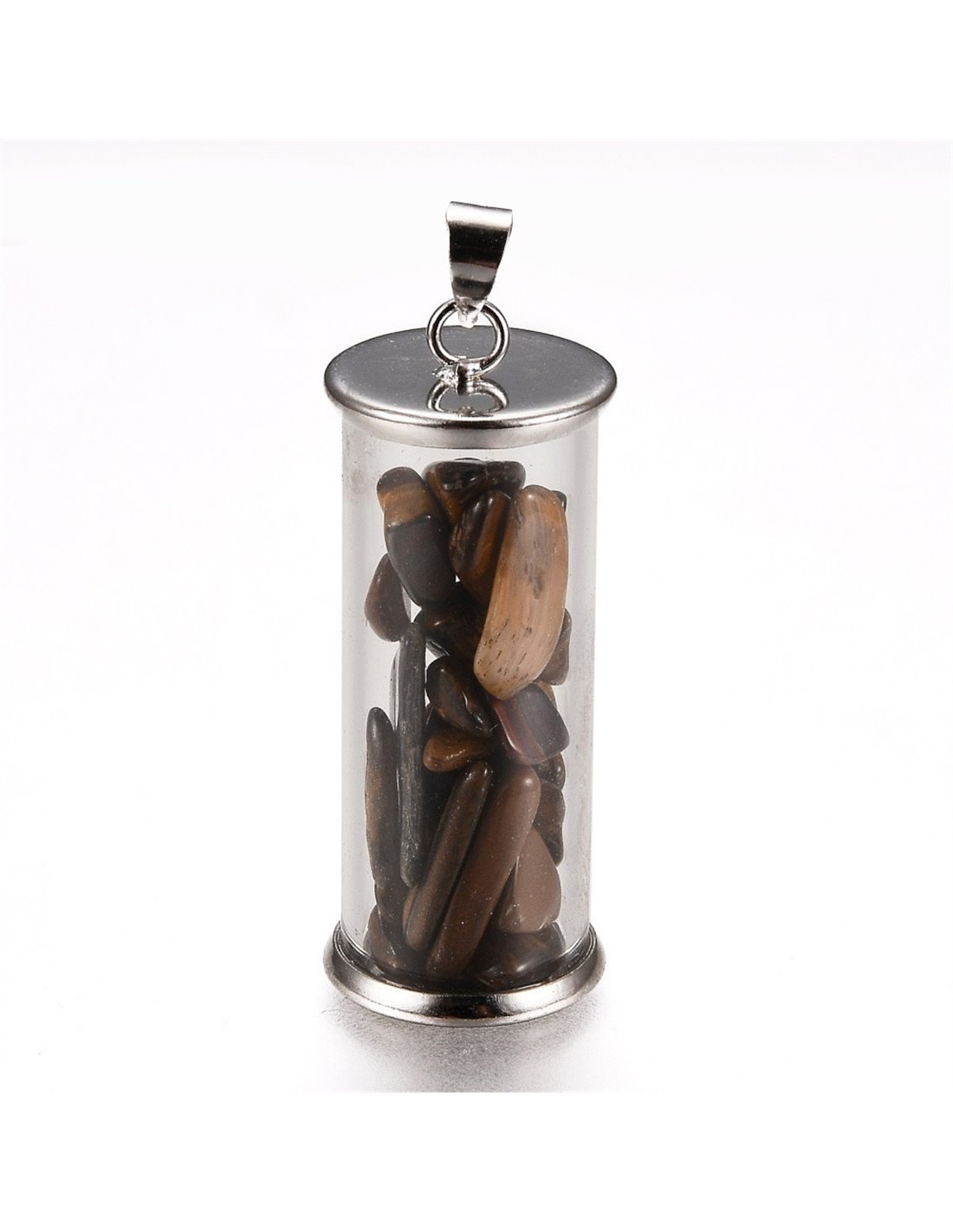 Colgante cilindro con piedrecitas de mineral ojo de tigre.