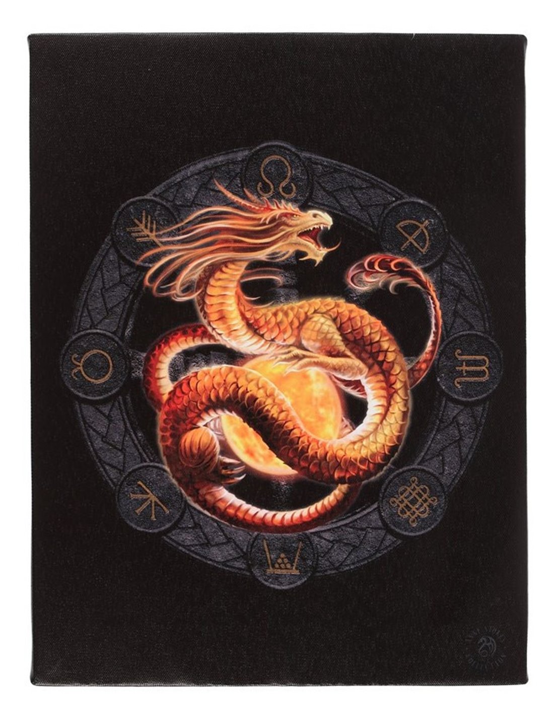 Esta poderosa obra de Anne Stokes representa al dragón en plena celebración de Litha, el solsticio de verano, símbolo de renacimiento, luz y poder elemental. El dragón irradia energía ardiente y protección, conectando con la fuerza vital del sol y la magia de la naturaleza en su máximo esplendor.