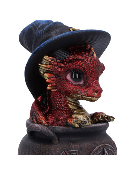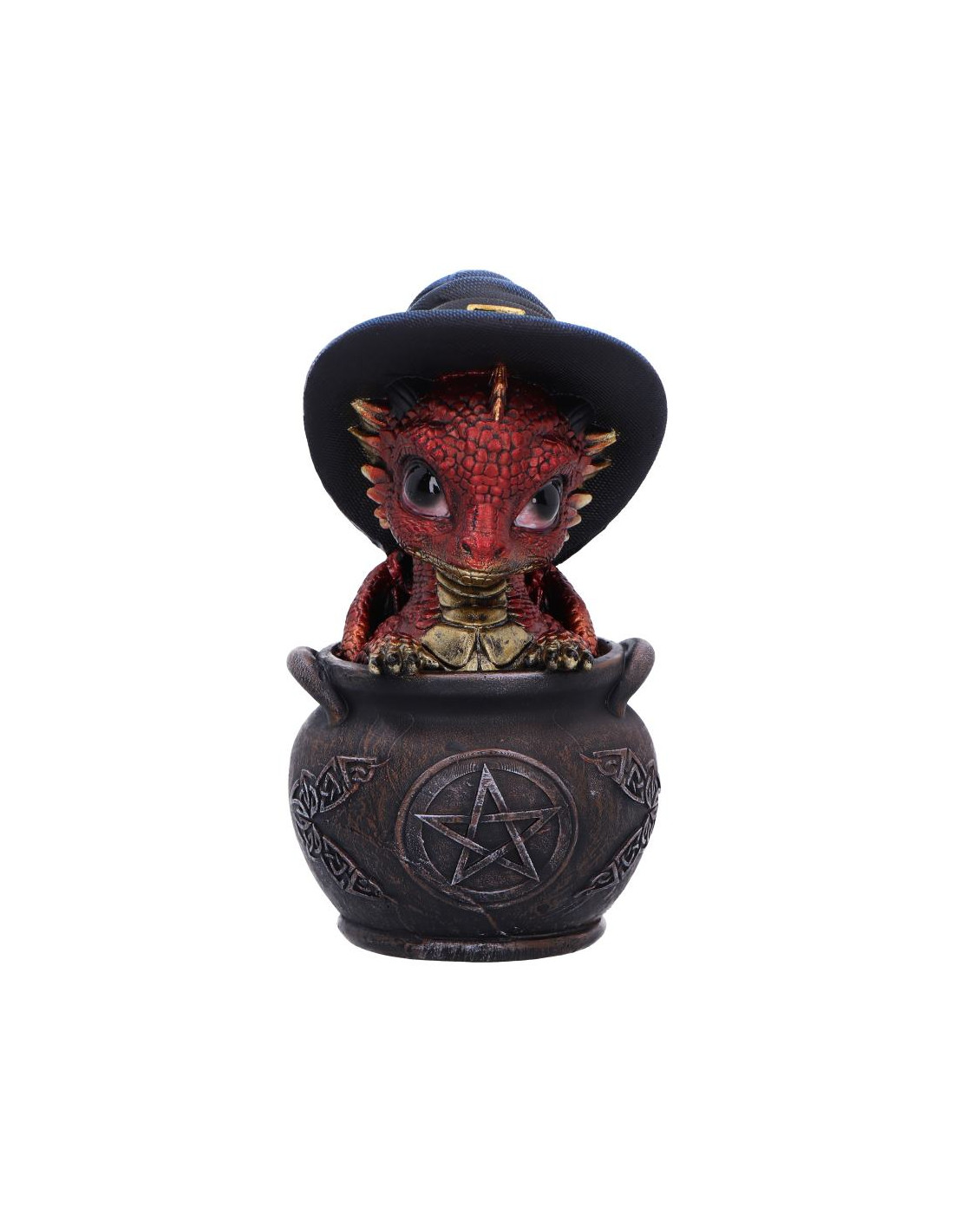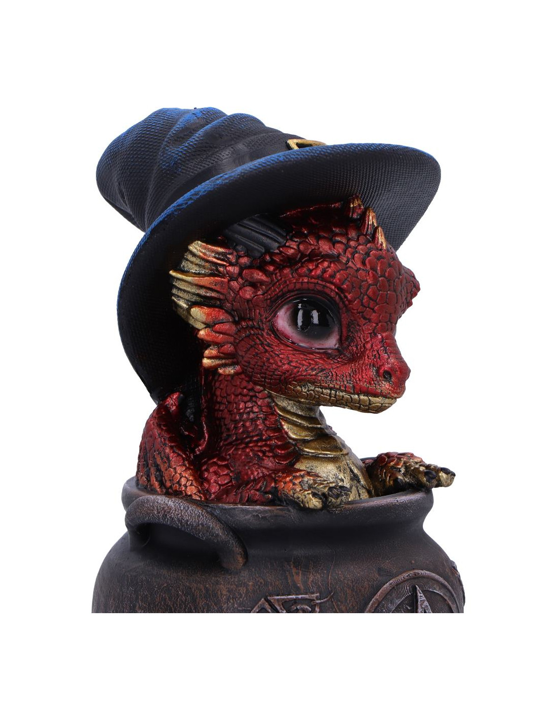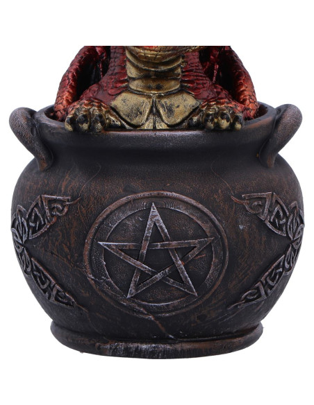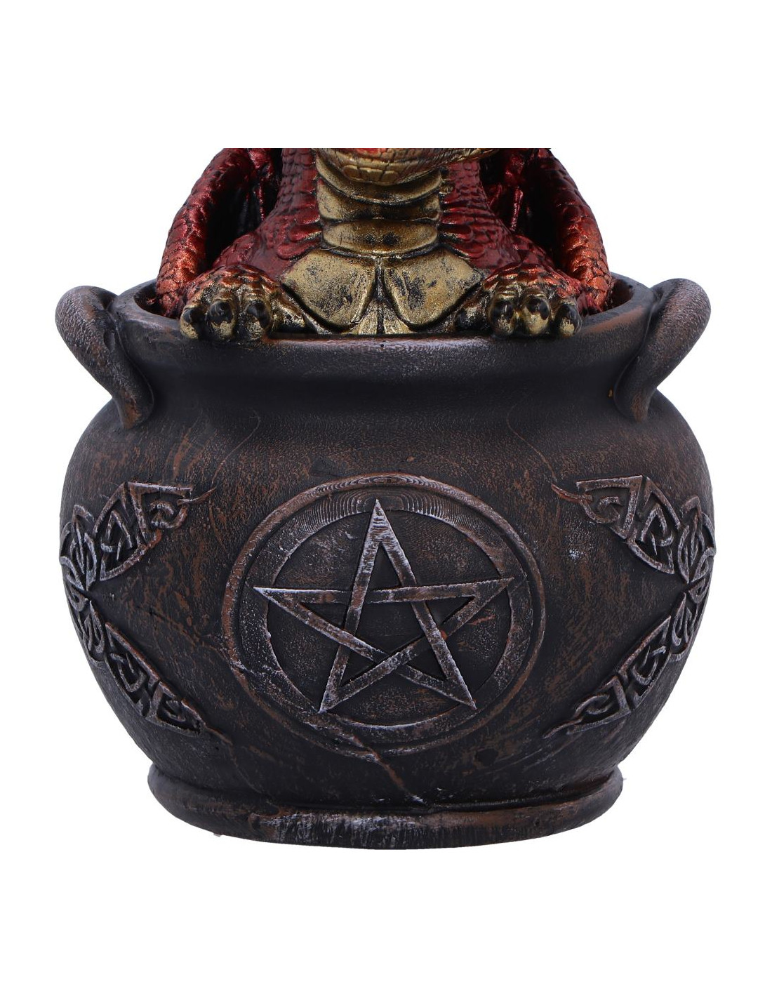 Una encantadora y divertida figura de dragón que representa a un dragón rojo ardiente emergiendo de un caldero de estilo gótico.
