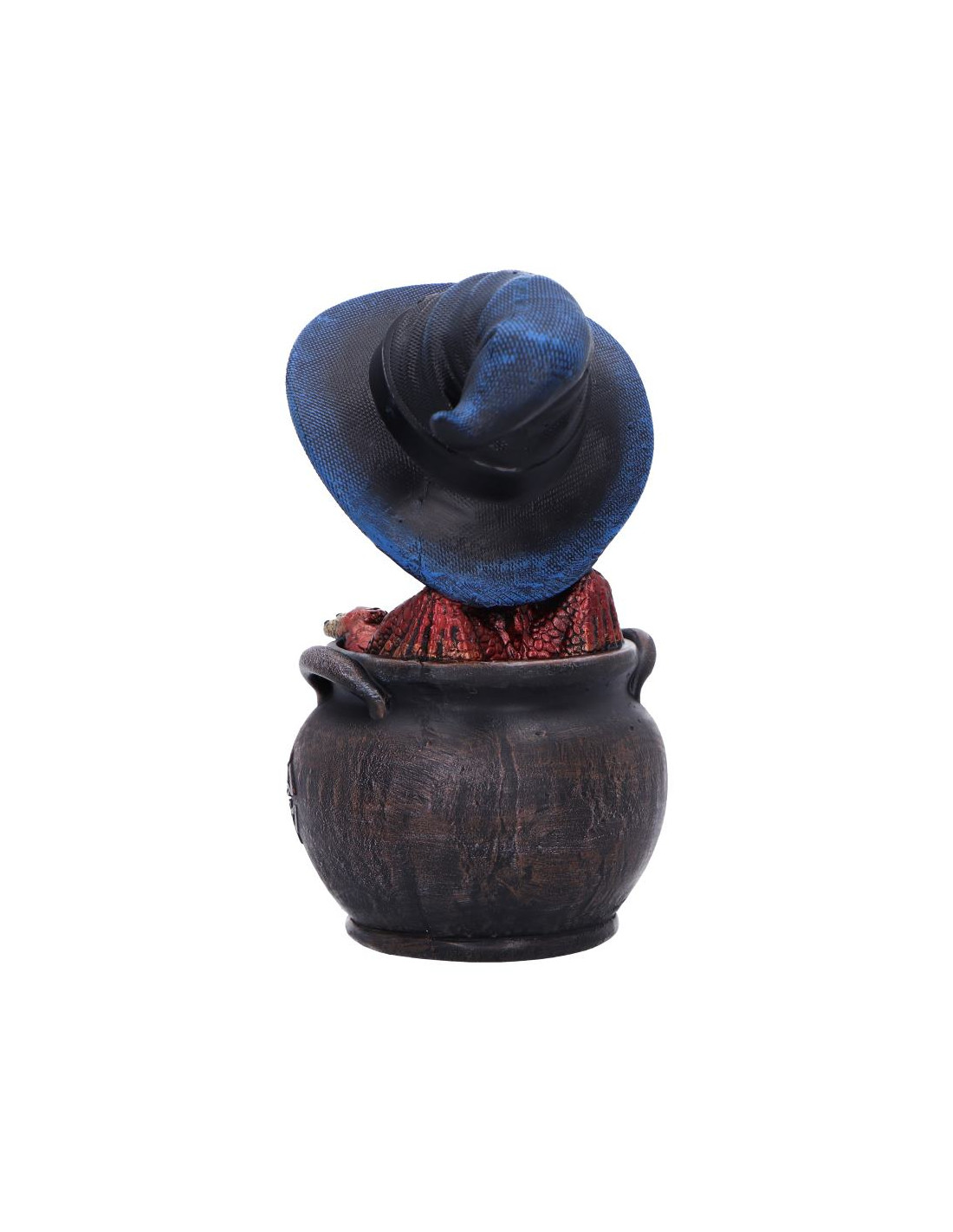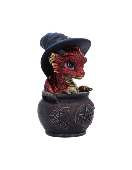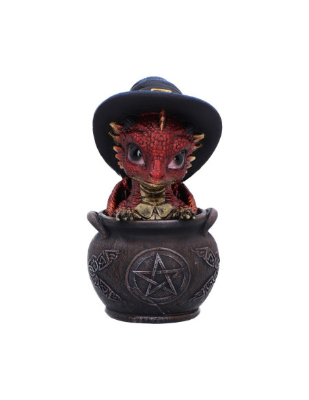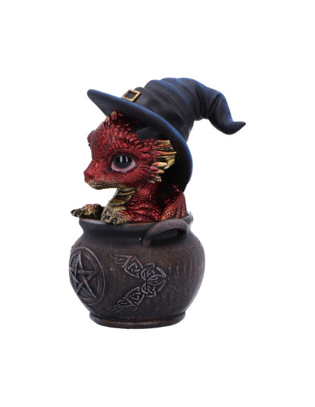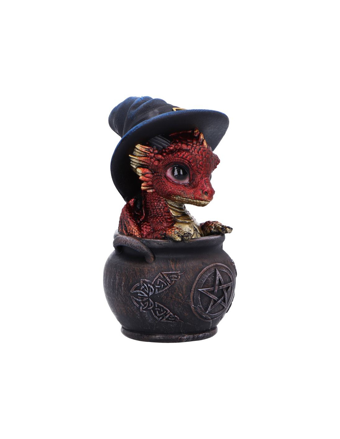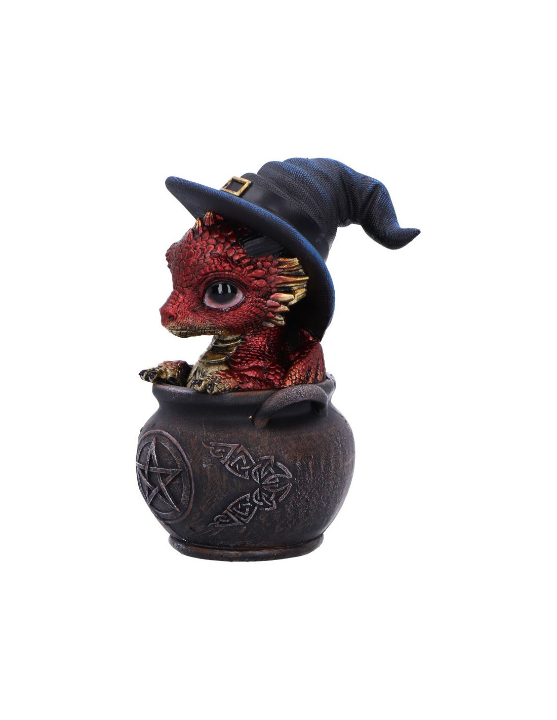 Una encantadora y divertida figura de dragón que representa a un dragón rojo ardiente emergiendo de un caldero de estilo gótico.