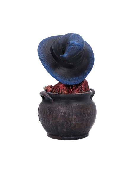 Presenta un diseño de resina fundido y pintado a mano con detalles intrincados, incluyendo un clásico sombrero de bruja, ricas texturas y vibrantes tonos rojos