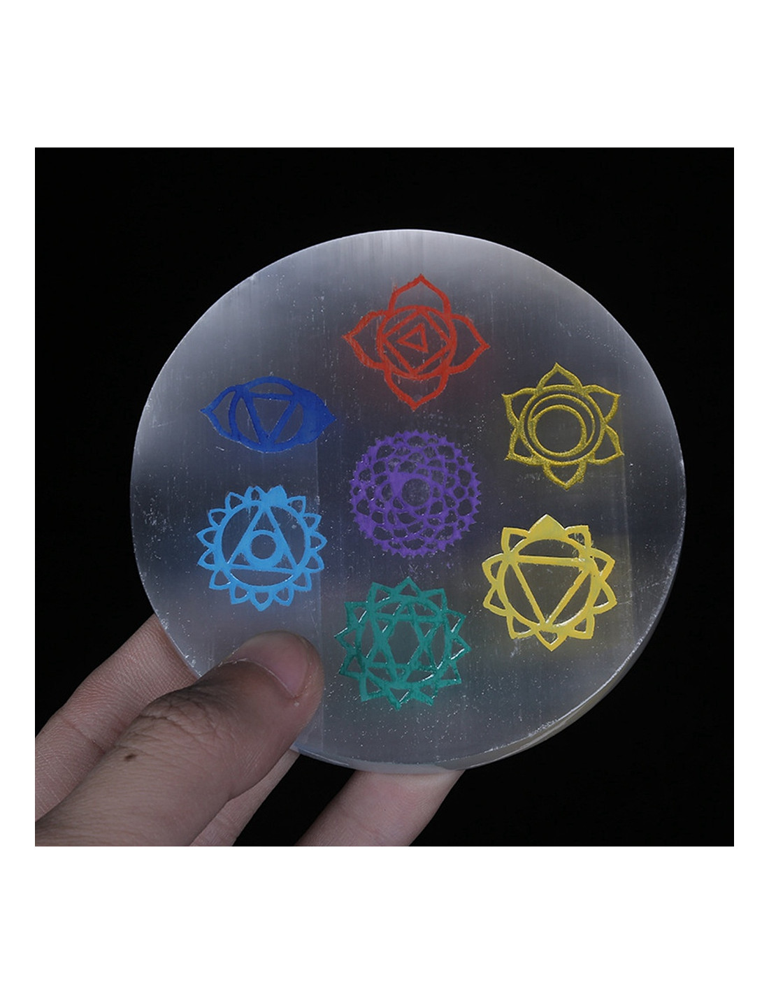 Placa de carga de selenita natural. Decorada con los 7 chakras
