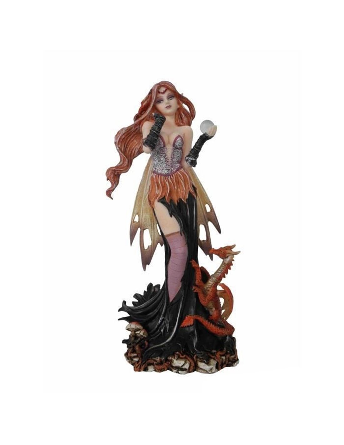 Bella hada peliroja con bola de cristal en mano y dragón rojo a sus pies.