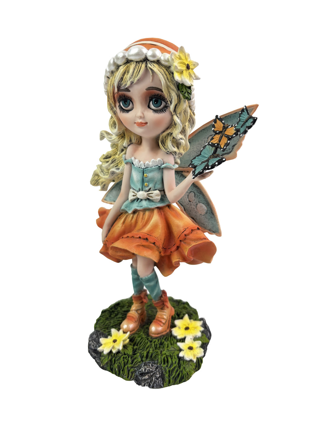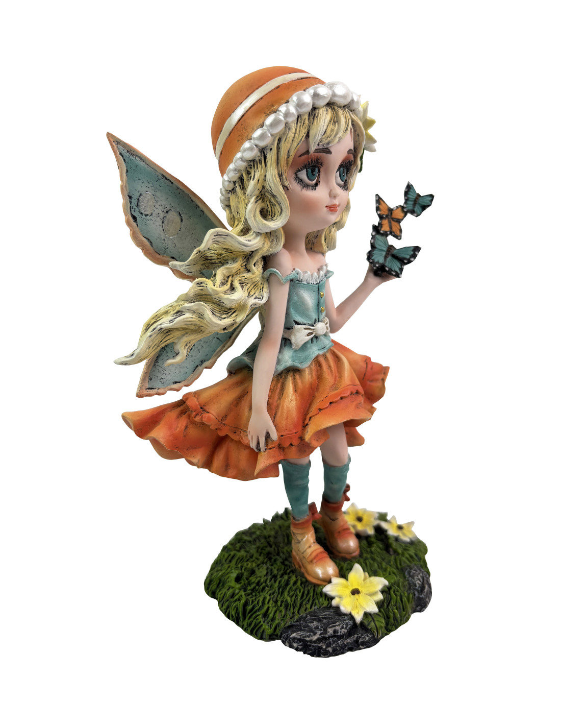 Lirael, vestida en tonos azules y naranjas, sostiene mariposas en sus manos, simbolizando la transformación, la libertad y la conexión con la naturaleza. Su presencia irradia magia, armonía y alegría, aportando un toque etéreo y encantador a cualquier espacio.