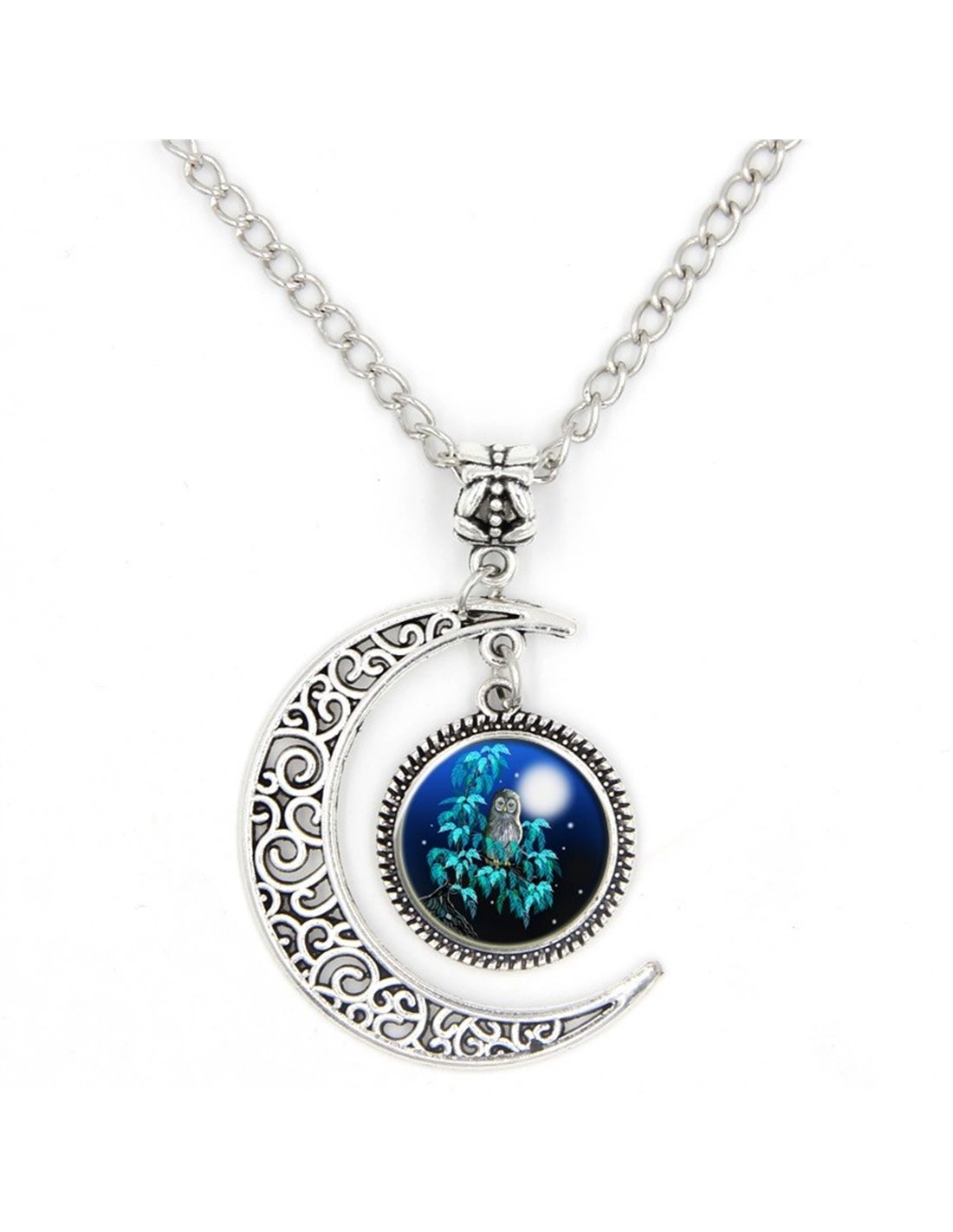 COLGANTE DE METAL CON FORMA DE LUNA Y COLGANTE REDONDO CON BUHO, CON CADENA Y CAJA DE PRESENTACION.