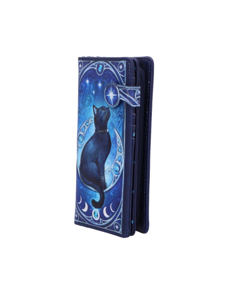 Fondo cósmico azul vibrante con fases lunares y estrellas. Con relieve y detallado diseño de gato negro y motivos celestiales.