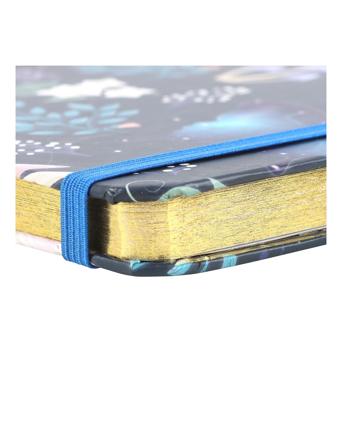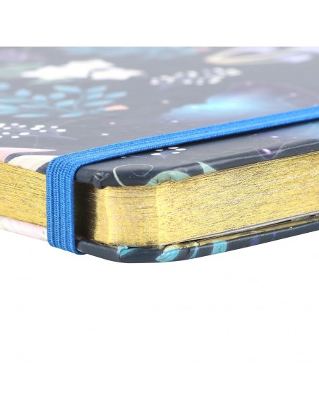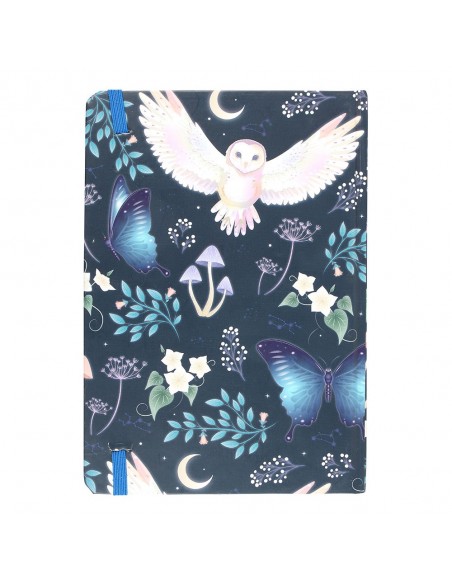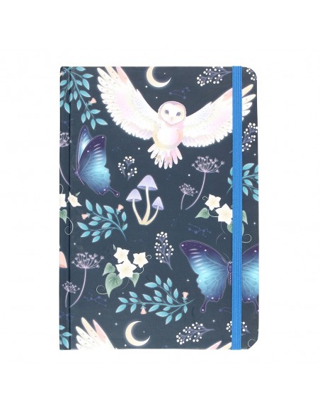 Ya sea para tomar notas, hacer listas o escribir un diario, este cuaderno A5 “Notebook Owl” transforma tu escritorio con un diseño místico protagonizado por un búho nocturno, rodeado de polillas, lunas crecientes y plantas del bosque. Sus páginas doradas y el práctico cierre elástico azul le aportan un toque de elegancia y funcionalidad.