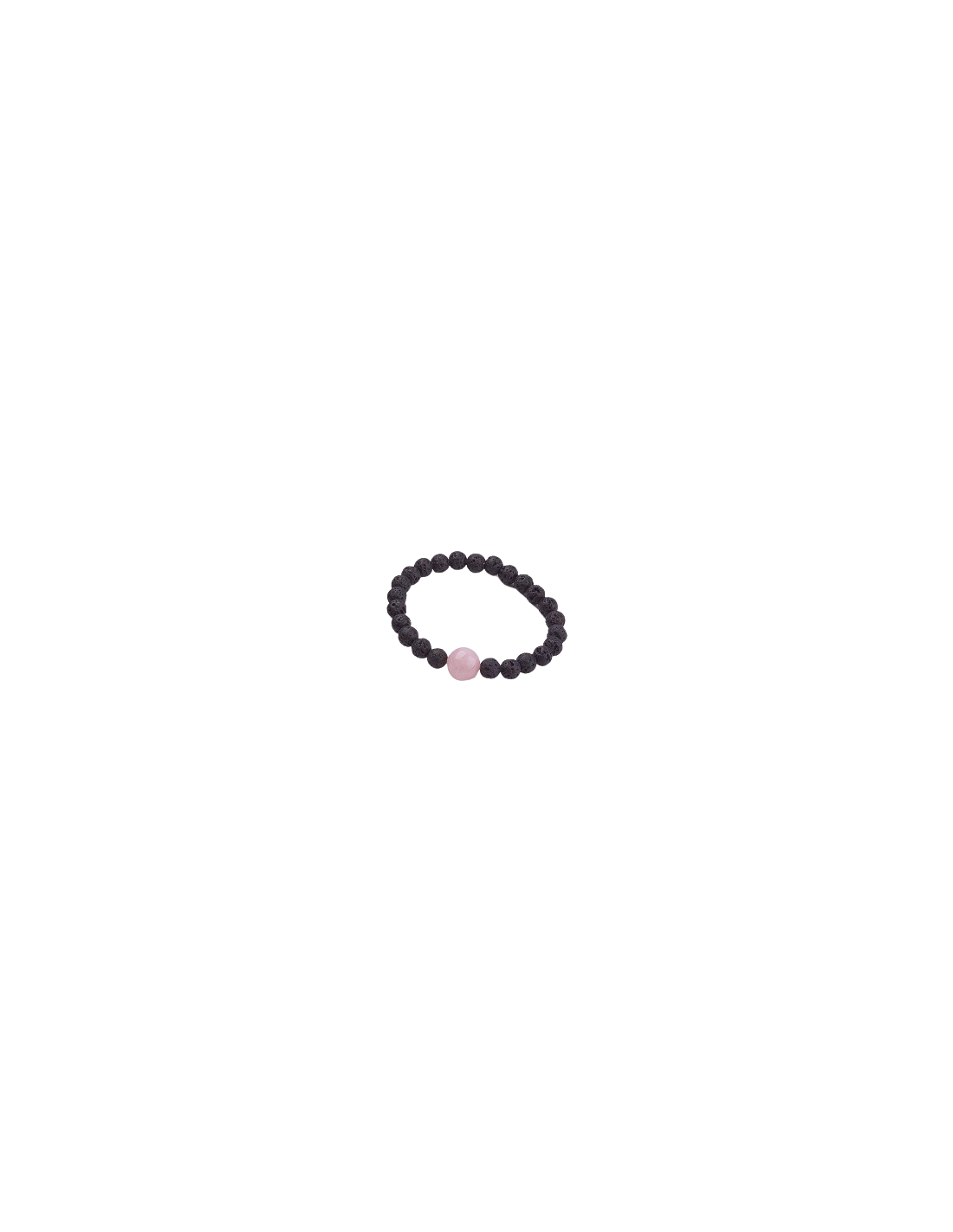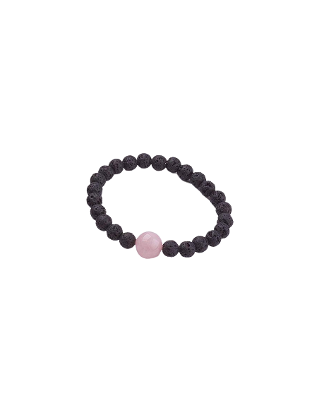 Pulsera elástica de bolas de lava natural y una central de cuarzo rosa.