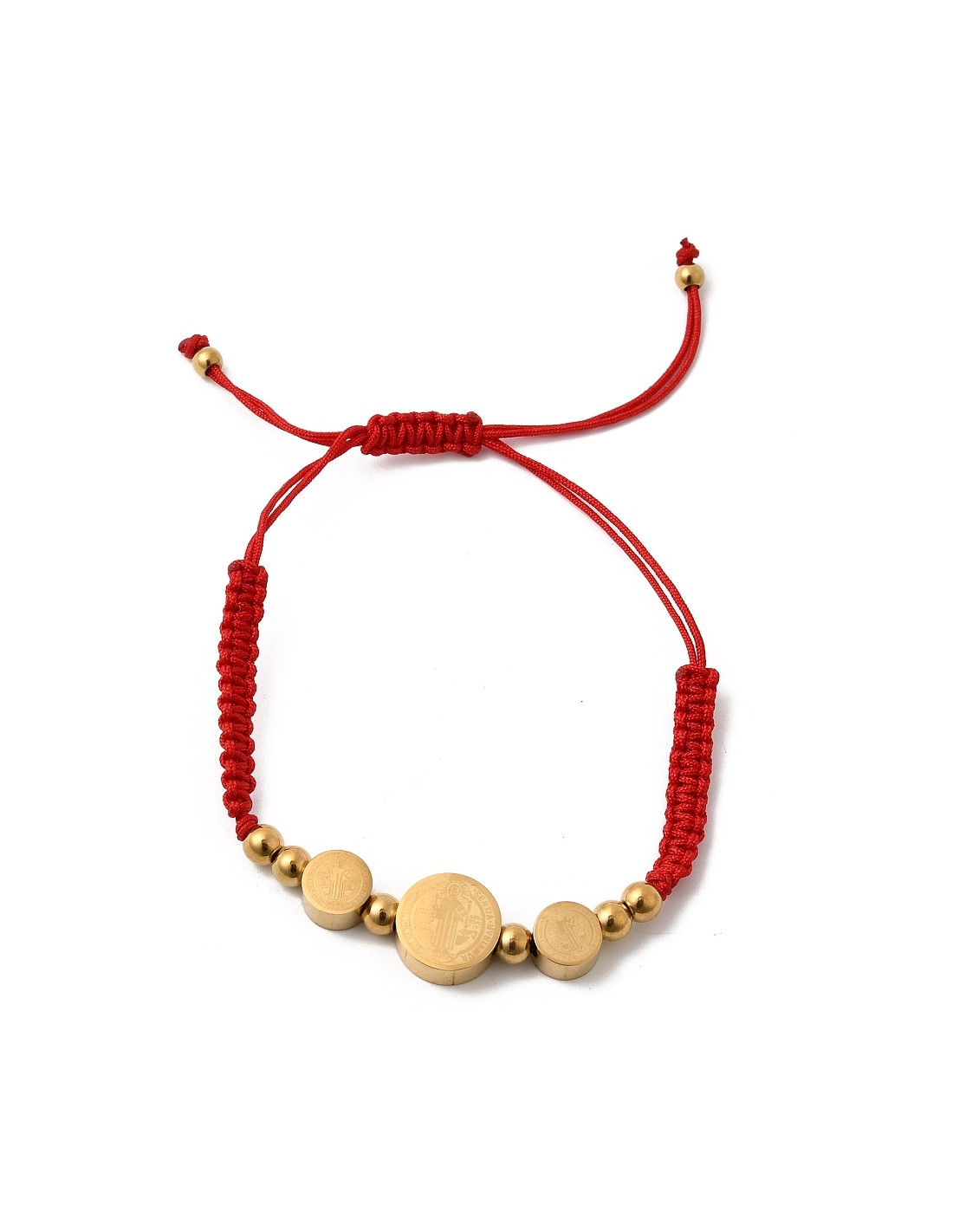 Pulsera ajustable de hilo, con tres amuletoa de Medalla de San Benito en acero bizantino.