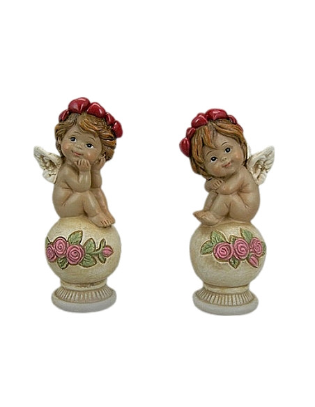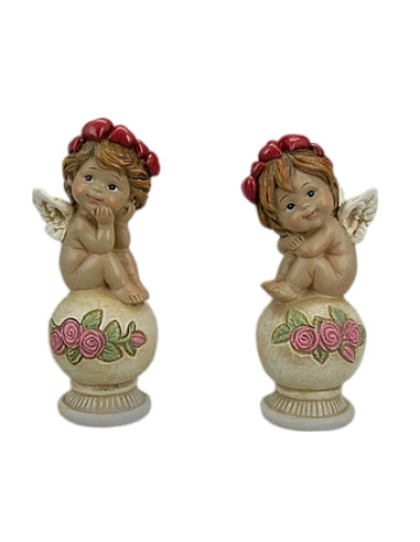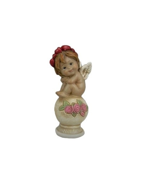 Este encantador querubín en tono marfil descansa serenamente sobre una bola, con una delicada corona de flores adornando su cabeza. Una pieza que evoca paz, pureza y belleza clásica.