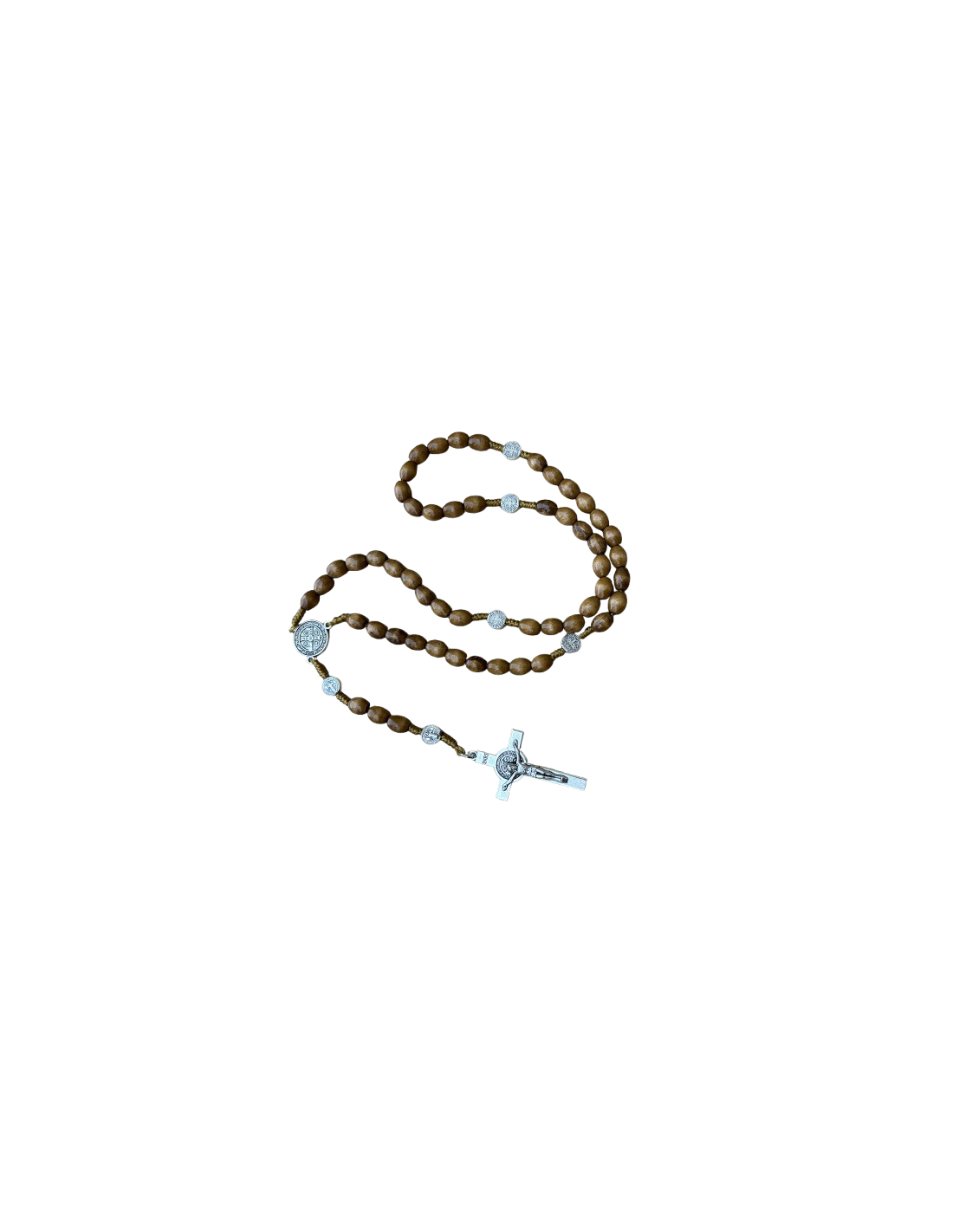Rosario de madera con medallas san benito y cruz, en aleación metal.
