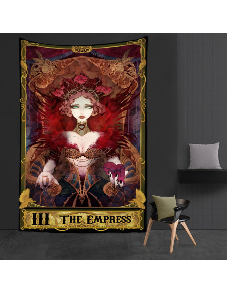 Este tapiz de 95x73 cm representa la carta de La Emperatriz, arcano mayor del Tarot asociado a la fertilidad, la belleza y la conexión con la naturaleza. Reina de lo terrenal y espiritual, simboliza la abundancia, la intuición maternal y el poder creador.